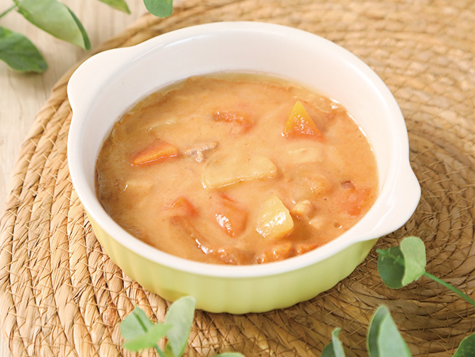 福井県は六条大麦の生産量が日本一。六条大麦粉で作った「六条大麦クリームシチュールゥ」を使用した甘くて優しい味のシチューです。
