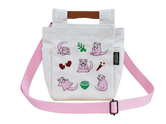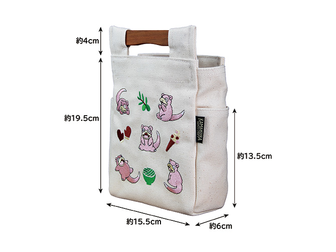 ヤドンや香川の名産品を刺繍で表現しました。ハンドルに香川県産の天然林山桜を使用した、どこか懐かしいけど新しいバッグ。桜の木の木肌は繊細で優美でありながら耐久性があります。持ち手から伝わる桜の木の温もりを楽しんでください。